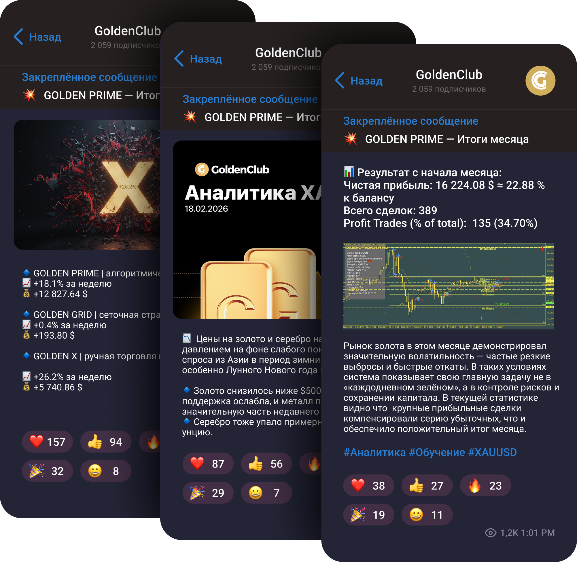 Основа Golden Club — команда профессиональных трейдеров с опытом работы на финансовых рынках от 6 до 15 лет. Мы объединили специалистов с разными стилями торговли и подходами: ручная торговля, алгоритмические стратегии, торговля советниками, скальпинг и среднесрочные сделки. Наша ключевая ценность — дисциплина, экспертиза и стабильный подход к торговле.